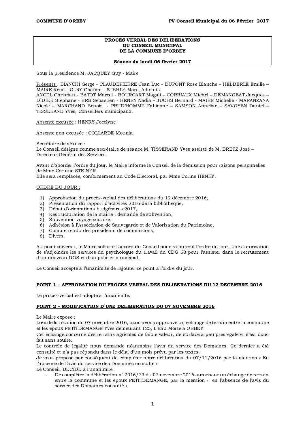 PV du Conseil Municipal du 06 Février 2017