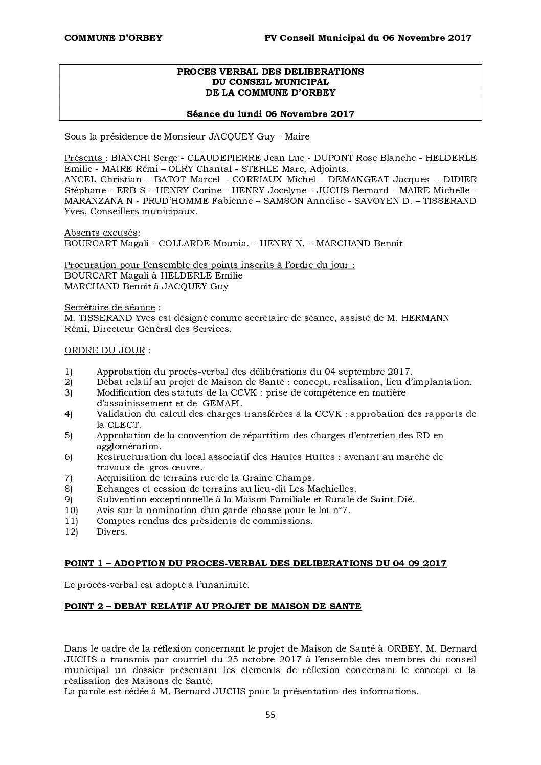 PV du Conseil Municipal du 06 Novembre 2017