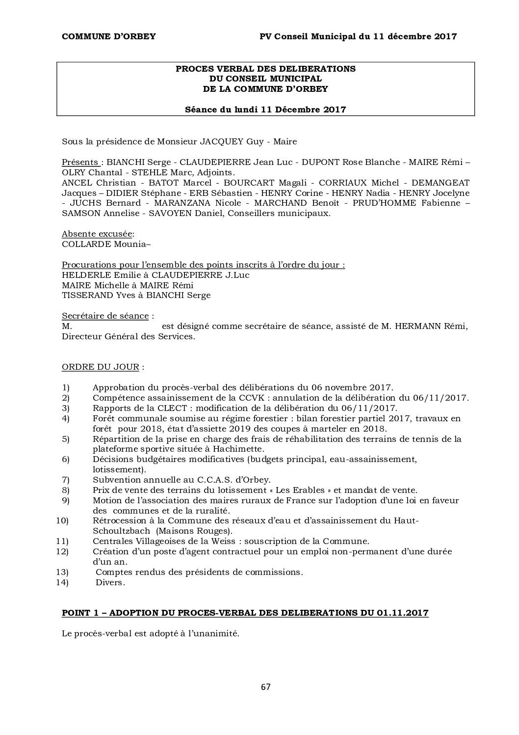 PV du Conseil Municipal du 11 Décembre 2017