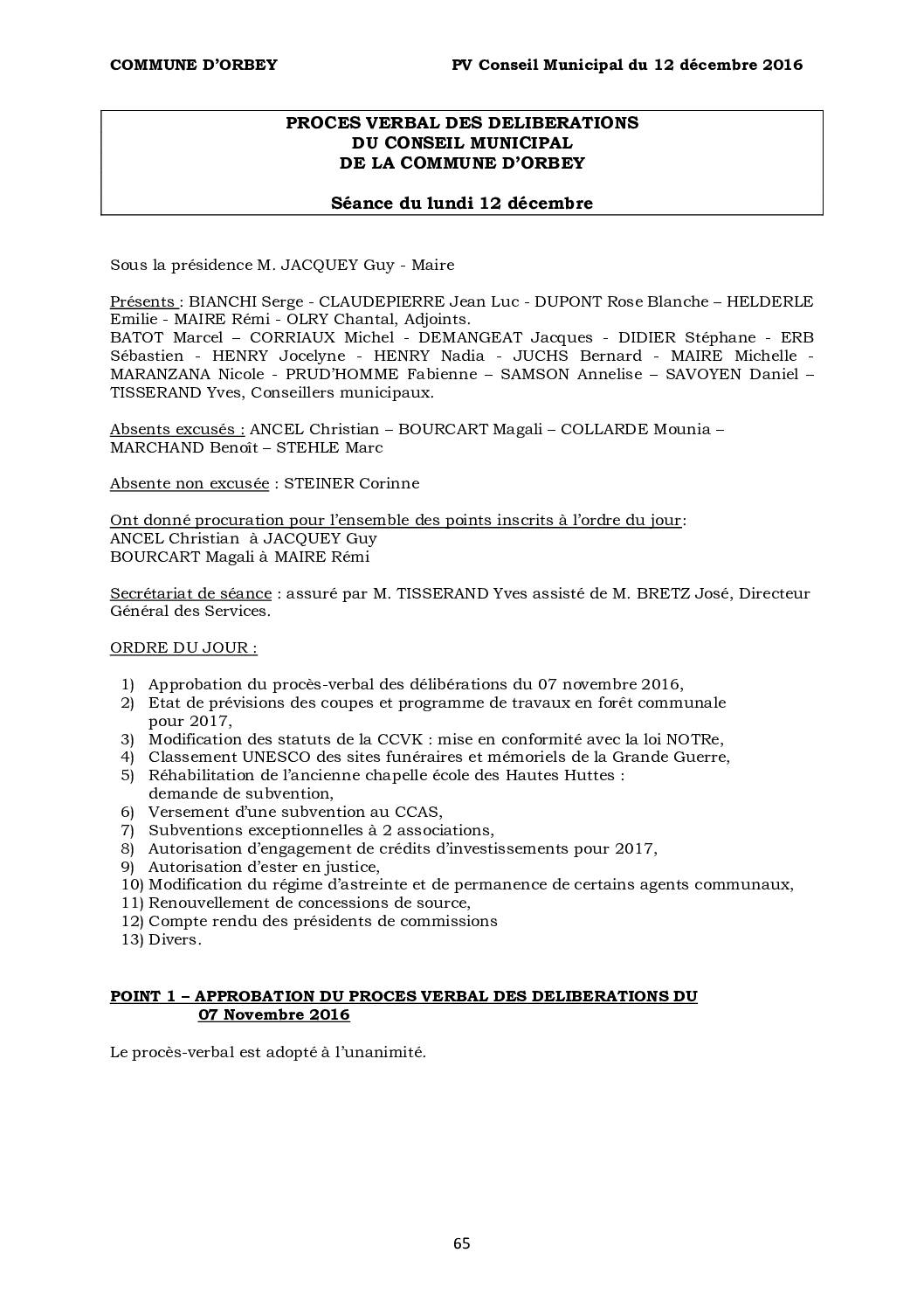 PV du Conseil Municipal du 12 décembre 2016