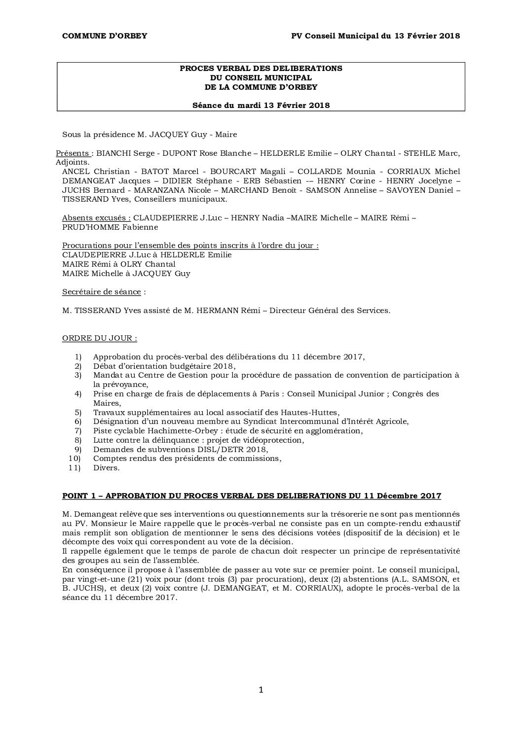 PV du Conseil Municipal du 13 février 2018